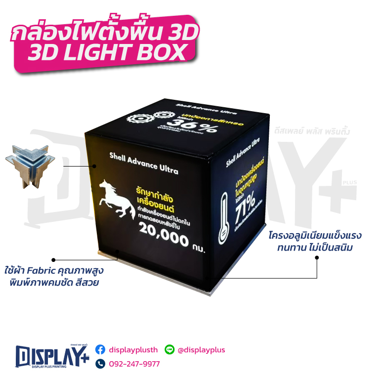 กล่องไฟผ้า 3D คือสื่อโฆษณาแบบเรืองแสงที่ออกแบบให้มีมิติรอบด้าน โดดเด่นสะดุดตา เหมาะสำหรับงานออกบูธ หน้าร้าน พื้นที่แสดงสินค้า ด้วยโครงสร้างแข็งแรงและผ้าพิมพ์คุณภาพสูงกล่องไฟผ้า 3D, ป้ายไฟ LED, Light Box ผ้า, Fabric Light Box, ป้ายโฆษณาเรืองแสง, กล่องไฟออกบูธ, ป้ายไฟตั้งพื้น, ป้ายไฟโชว์สินค้า