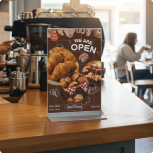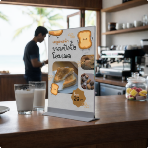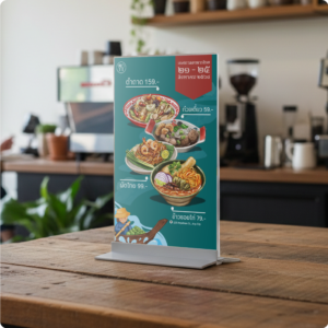 ป้ายอะคริลิคตั้งโต๊ะ ฐานอะลูมิเนียม ดีไซน์เรียบหรู เหมาะสำหรับใช้งานในร้านค้า คาเฟ่ ร้านอาหาร ออฟฟิศ หรือจุดประชาสัมพันธ์ต่าง ๆ ช่วยสื่อสารข้อมูล โปรโมชั่น เมนู หรือป้ายได้อย่างชัดเจน เพิ่มความเป็นมืออาชีพให้กับพื้นที่ใช้งาน ตัวป้ายผลิตจากอะคริลิคใสคุณภาพสูง มองเห็นชัดทั้ง 2 หน้า ป้ายตั้งโต๊ะ, Table Sign, ป้ายอะคริลิคตั้งโต๊ะ, ป้ายเมนูตั้งโต๊ะ, ป้ายโปรโมชั่น,ป้ายอะคริลิคใส, ป้ายฐานอะลูมิเนียม, ป้ายร้านอาหาร, ป้ายคาเฟ่