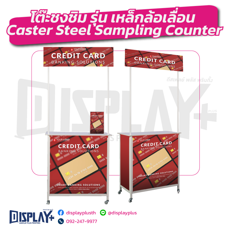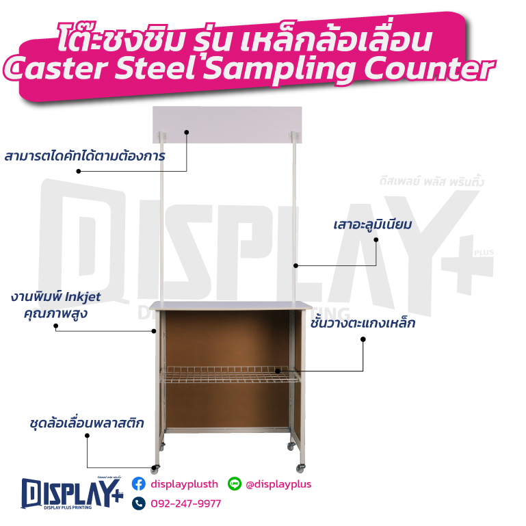 โครงสร้างน้ำหนักเบา เคลื่อนย้ายสะดวก มีล้อด้านล่าง รองรับการใช้งานทั้งในร่มและกลางแจ้ง พื้นที่หน้าโต๊ะกว้าง เหมาะสำหรับวางสินค้า อุปกรณ์ชงชิม หรือแจกตัวอย่างสินค้าได้อย่างลงตัว เหมาะกับธุรกิจอาหาร เครื่องดื่ม งานอีเวนต์ งานแสดงสินค้า (Booth Exhibition) และการตลาดหน้าร้าน