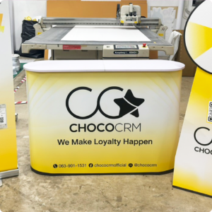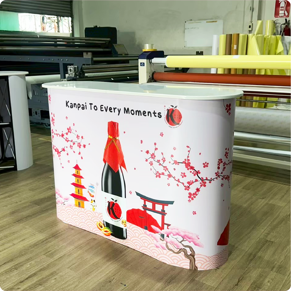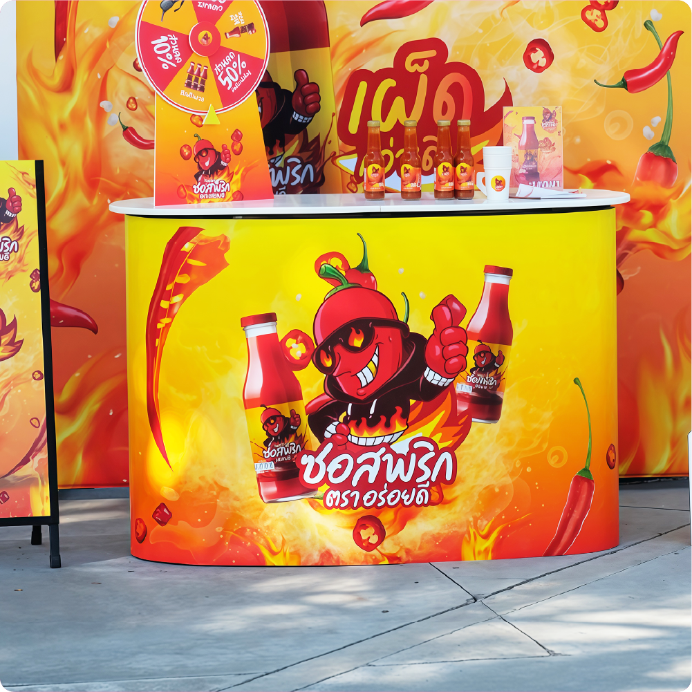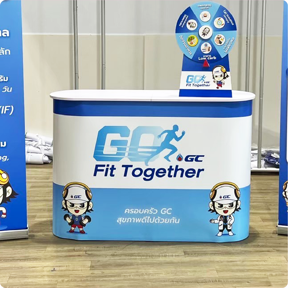 แผงกราฟิกด้านหน้าสามารถสั่งพิมพ์โลโก้หรือดีไซน์แบรนด์ได้ ช่วยเพิ่มความโดดเด่นและความเป็นมืออาชีพให้กับบูธของคุณ เหมาะสำหรับร้านค้า แบรนด์สินค้า หรือองค์กรที่ต้องการสร้างภาพลักษณ์น่าเชื่อถือในงานแสดงต่าง ๆเคาน์เตอร์ออกบูธ, โต๊ะออกบูธ, เคาน์เตอร์พับได้, Pop Up Counter, โต๊ะแสดงสินค้า, เคาน์เตอร์ขายของ, อุปกรณ์ออกบูธ, โต๊ะโปรโมทสินค้า