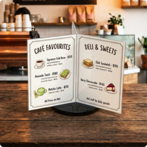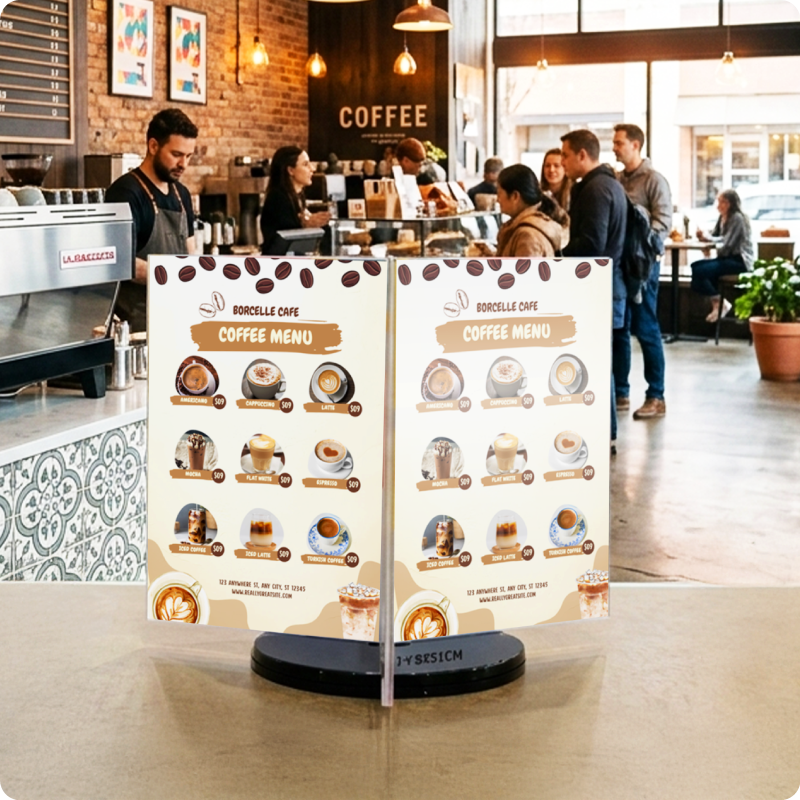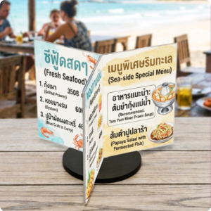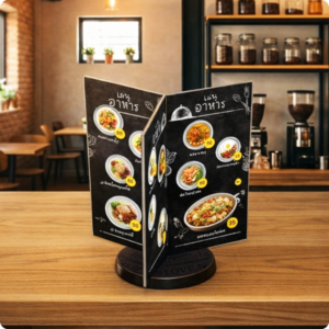 ดีไซน์ 6 หน้า ดูทันสมัย เหมาะกับร้านค้า คาเฟ่ ร้านอาหาร บูธแสดงสินค้า งานอีเวนต์ หรือเคาน์เตอร์ประชาสัมพันธ์ ช่วยเพิ่ม ความโดดเด่นให้แบรนด์ และเพิ่มโอกาสการมองเห็นโปรโมชั่นได้มากขึ้น ป้ายโปรโมชั่นหน้าร้าน ป้ายตั้งโต๊ะร้านอาหาร ป้ายโฆษณาเคาน์เตอร์ ป้ายประชาสัมพันธ์บริษัท ป้ายเมนูหมุนได้