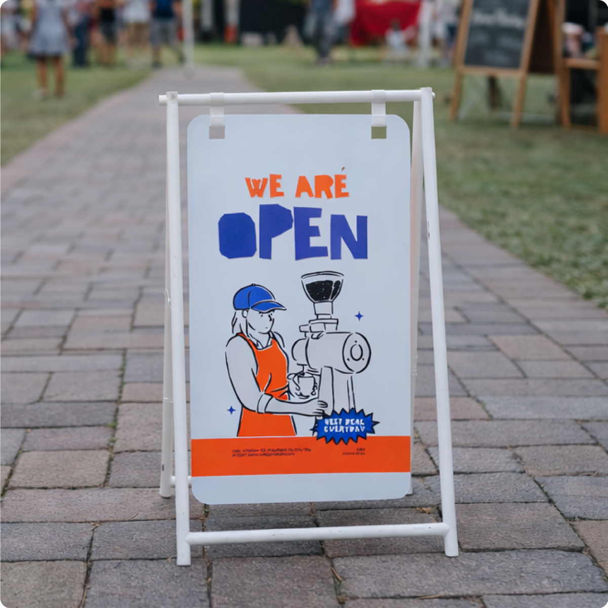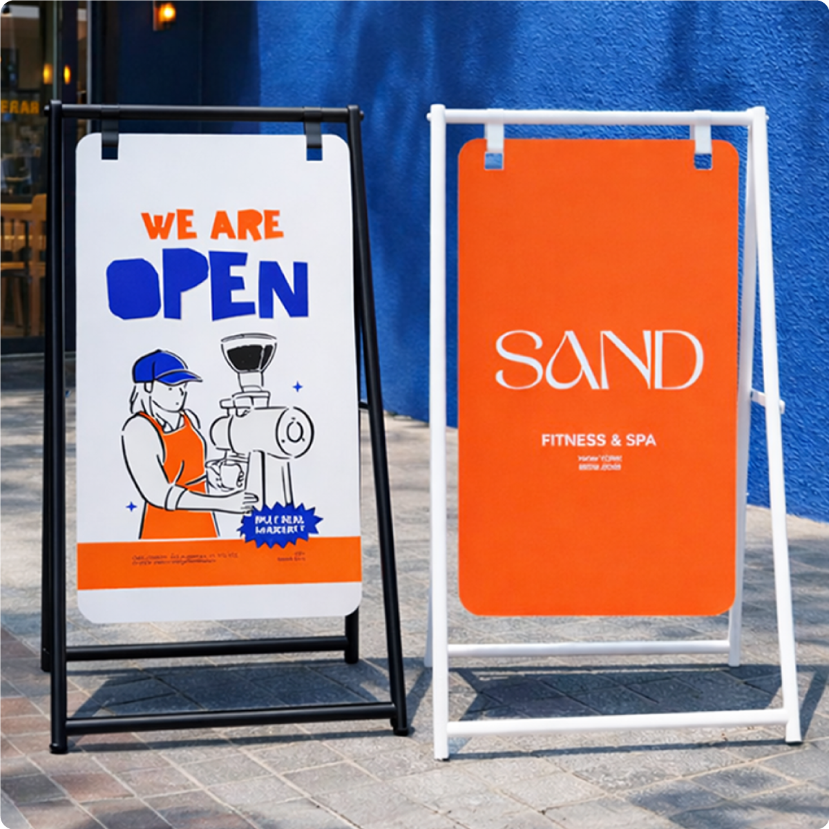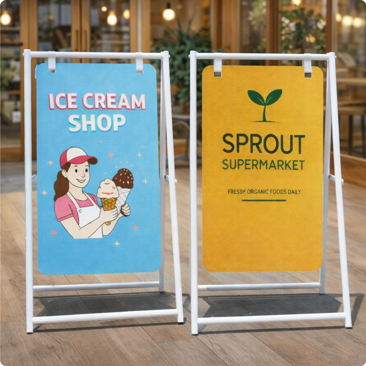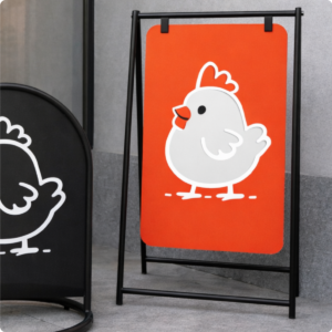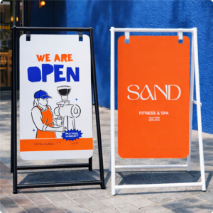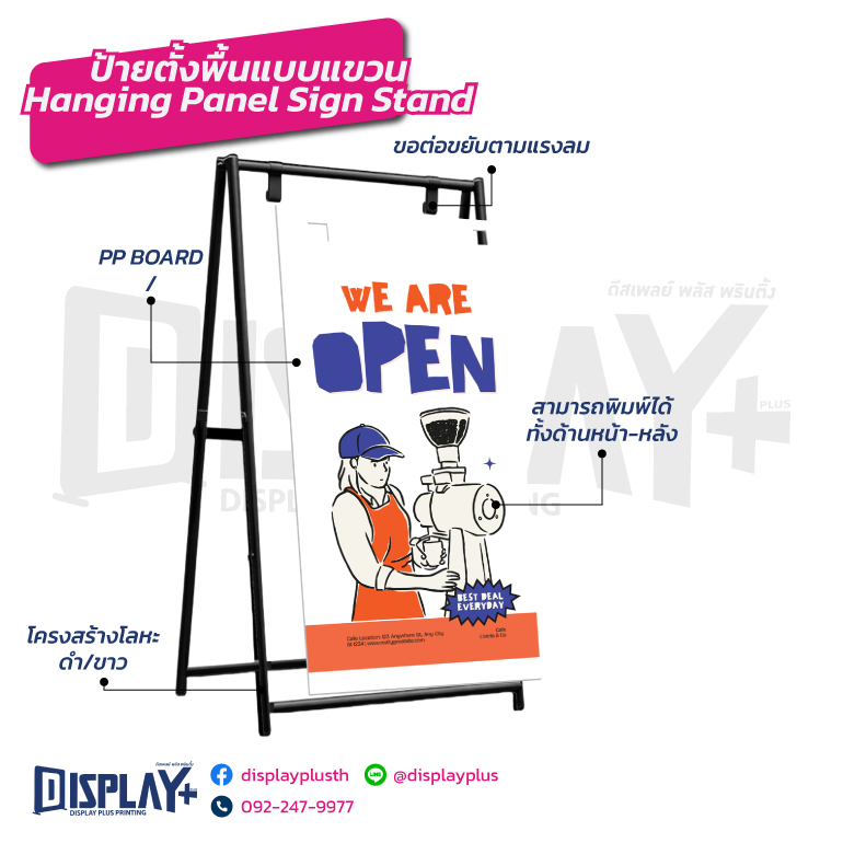 ป้ายเเขวนสองหน้าวัสดุ โครงเหล็กพ่นสี มีให้เลือกทั้งสีขาวเเละสีดำ ช่วยเพิ่มการมองเห็นจากทั้งสองทิศทาง เหมาะสำหรับร้านค้า คาเฟ่ ฟิตเนส ร้านอาหาร และงานอีเวนต์ต่างๆ แข็งแรง แผ่นป้ายถอดเปลี่ยนได้ ป้ายแขวนสองหน้า,ป้ายหน้าร้าน,ป้ายตั้งพื้น, ป้ายโฆษณาหน้าร้าน, ป้ายโปรโมชัน, ป้ายเหล็กแขวน, ป้ายร้านค้า, ป้ายร้านคาเฟ่