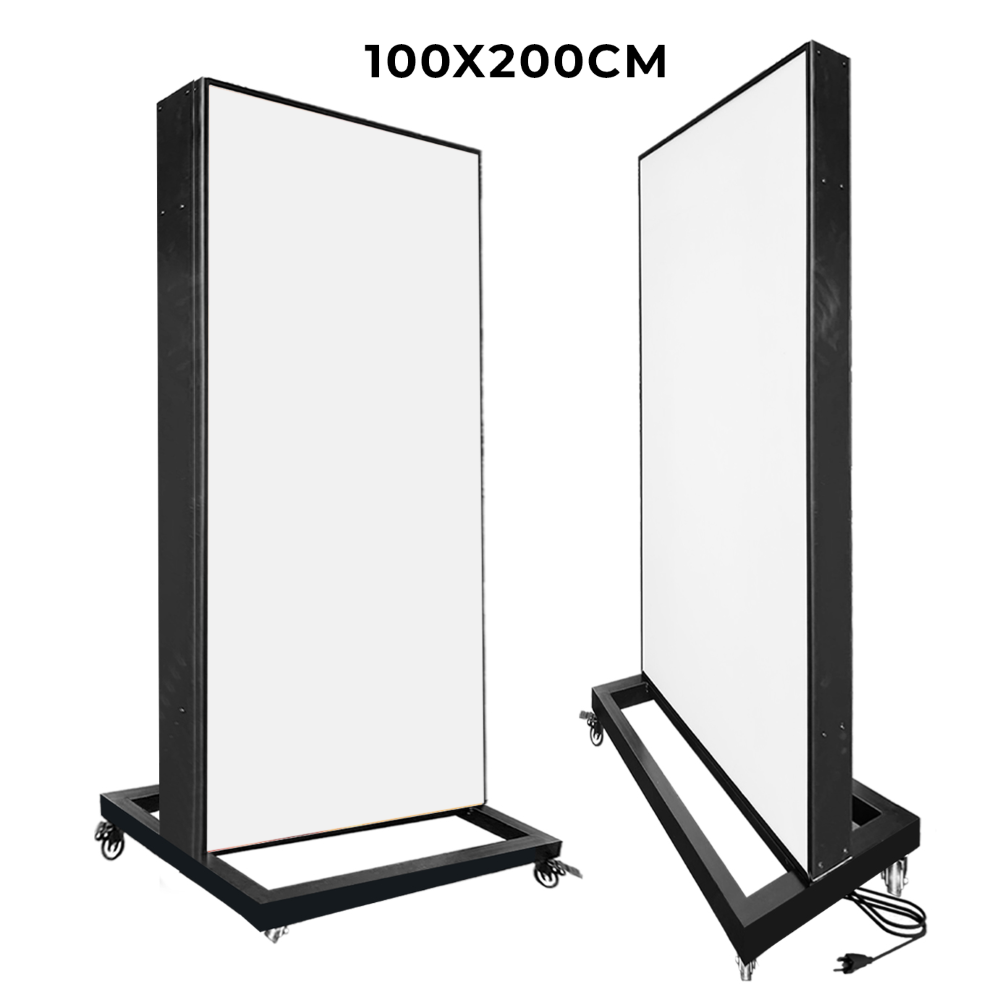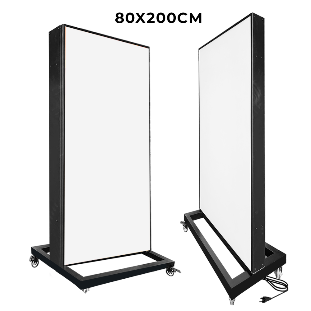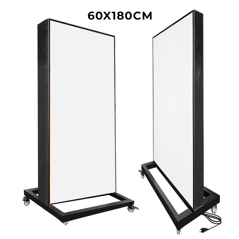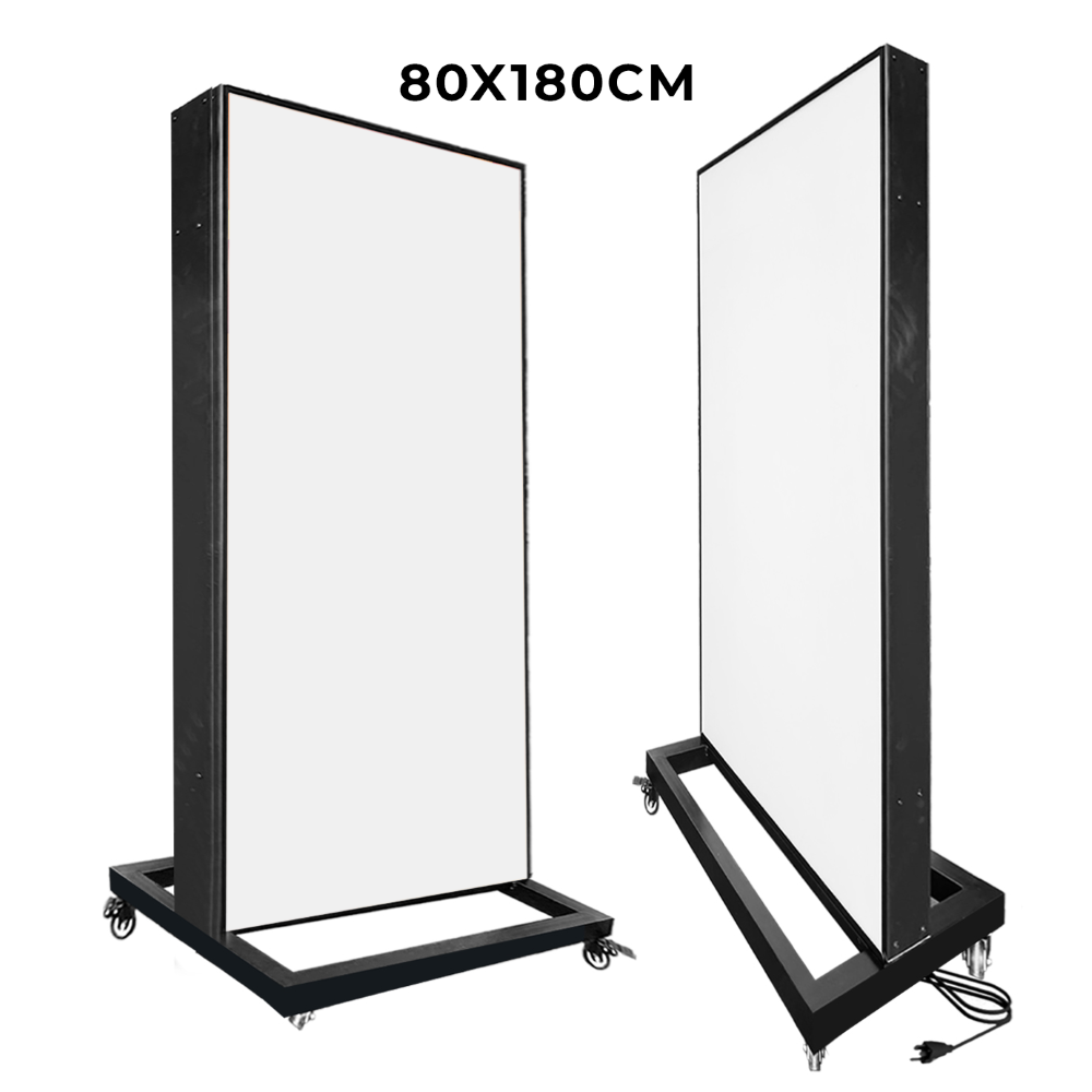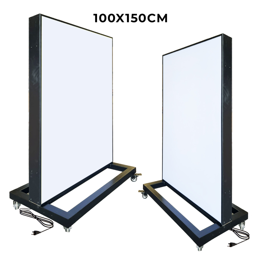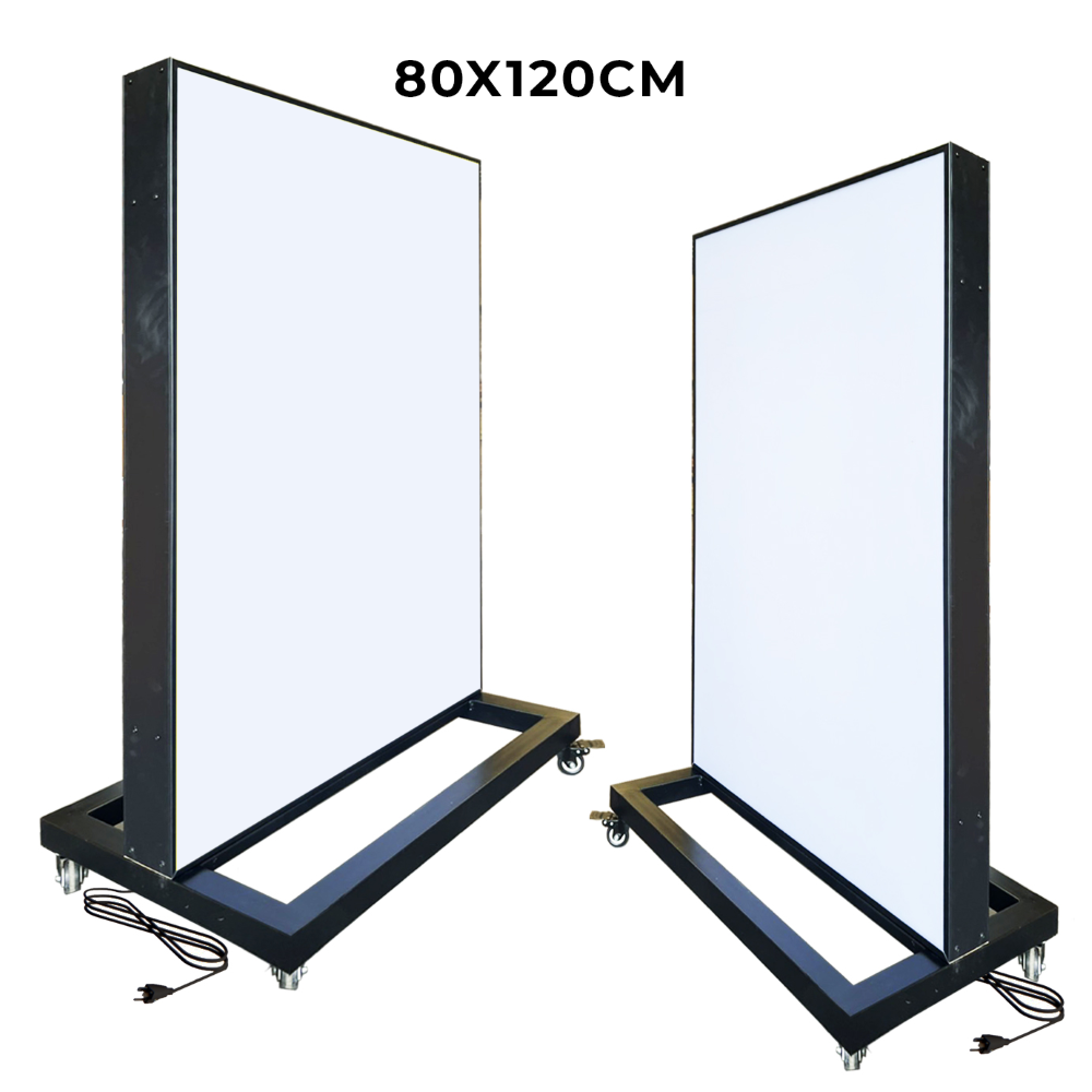 ตู้ไฟล้อเลื่อน ป้ายไฟตั้งพื้น ตู้ไฟตั้งพื้น ป้ายไฟLED พร้อมล้อเลื่อน เคลื่อนย้ายสะดวก วัสดุโครงเหล็กปิดทับด้วยแผ่นซิงค์ขึ้นรูป ทำสีดำ เหมาะสำหรับภายนอกอาคาร โชว์งานพิมพ์ 2 ด้าน